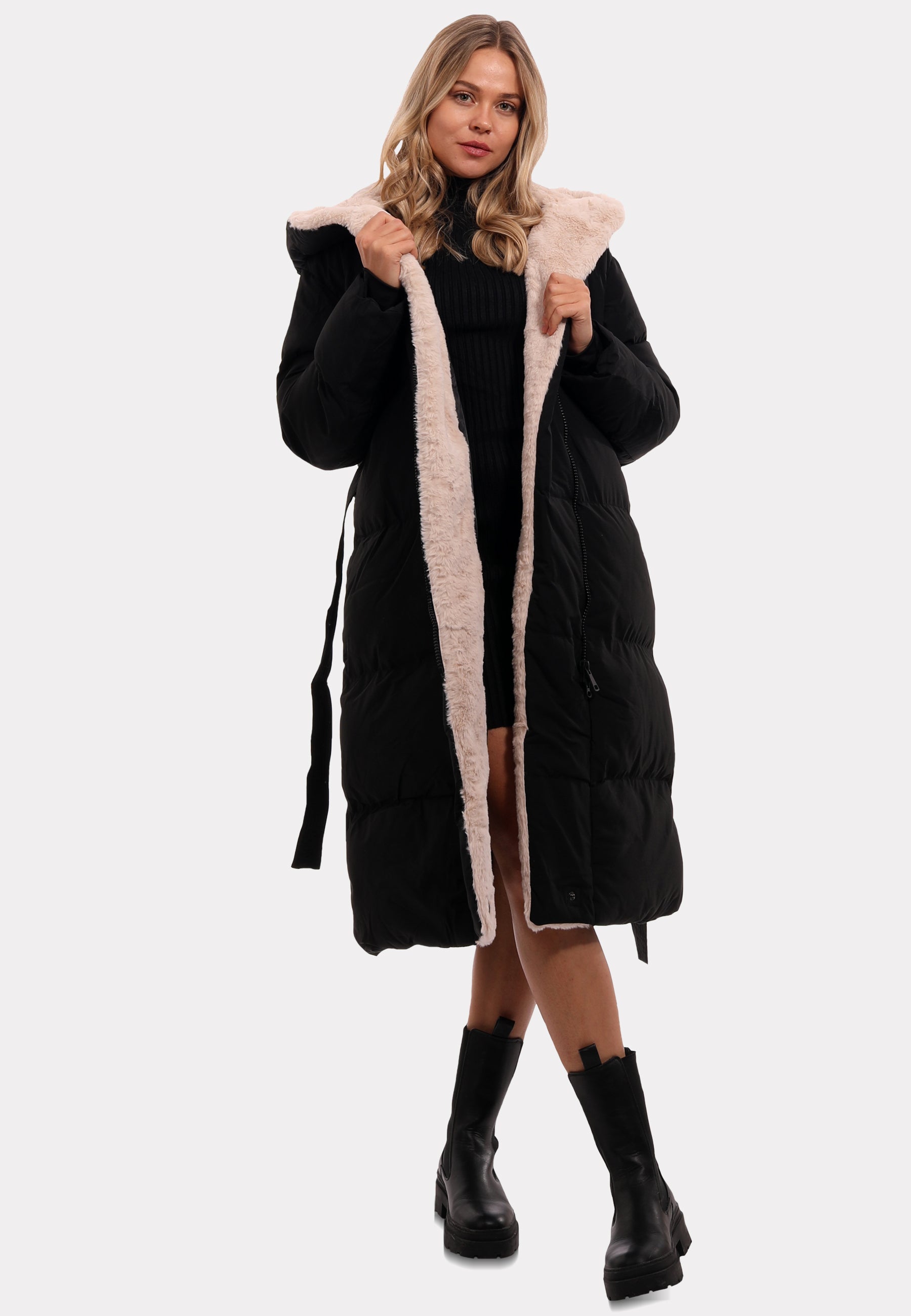 Design: Ein schlichtes, schwarzes Finish bietet vielseitige Kombinationsmöglichkeiten, während der weiche Kunstpelz am Kragen und entlang der Vorderseite einen eleganten Kontrast bildet.