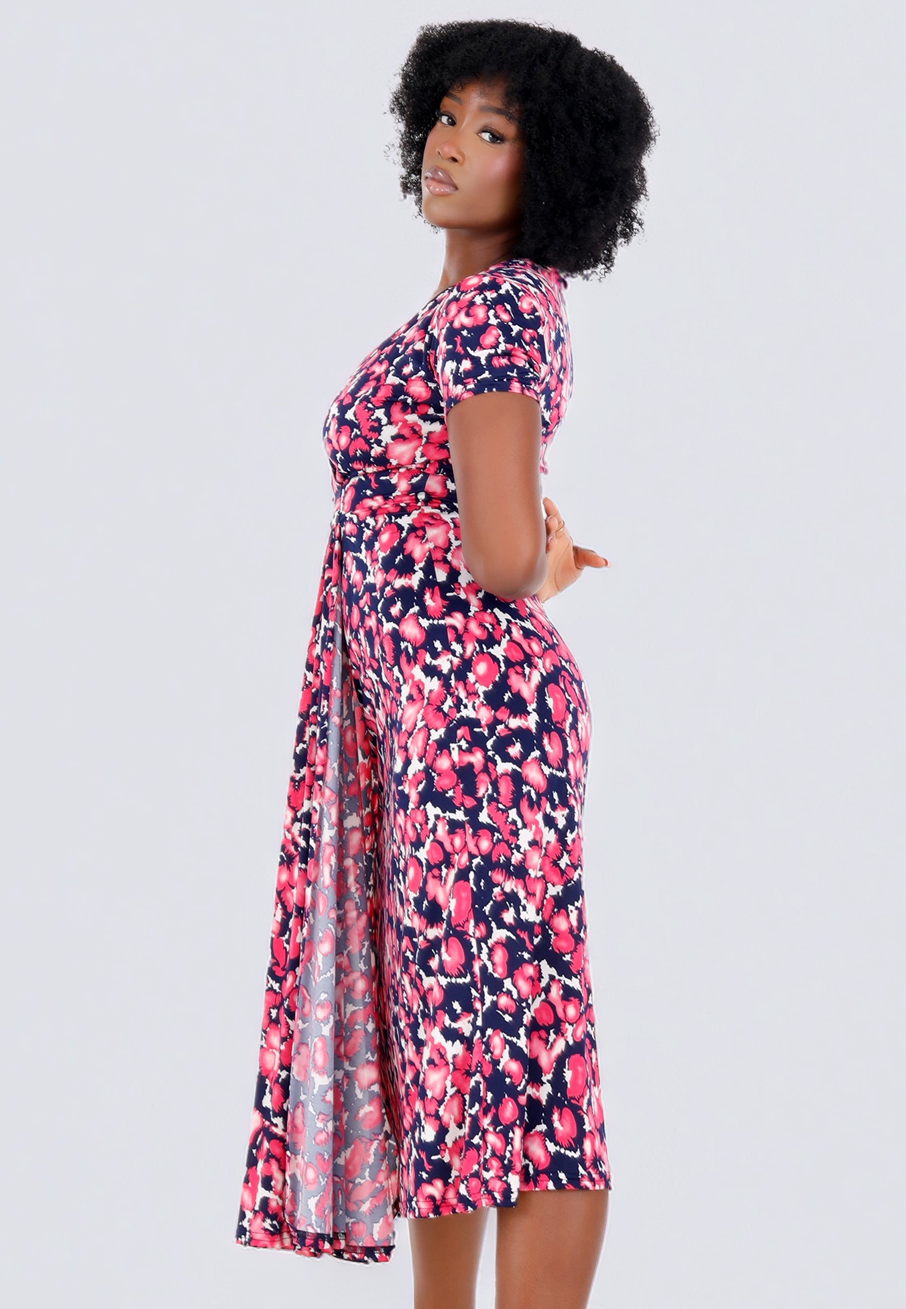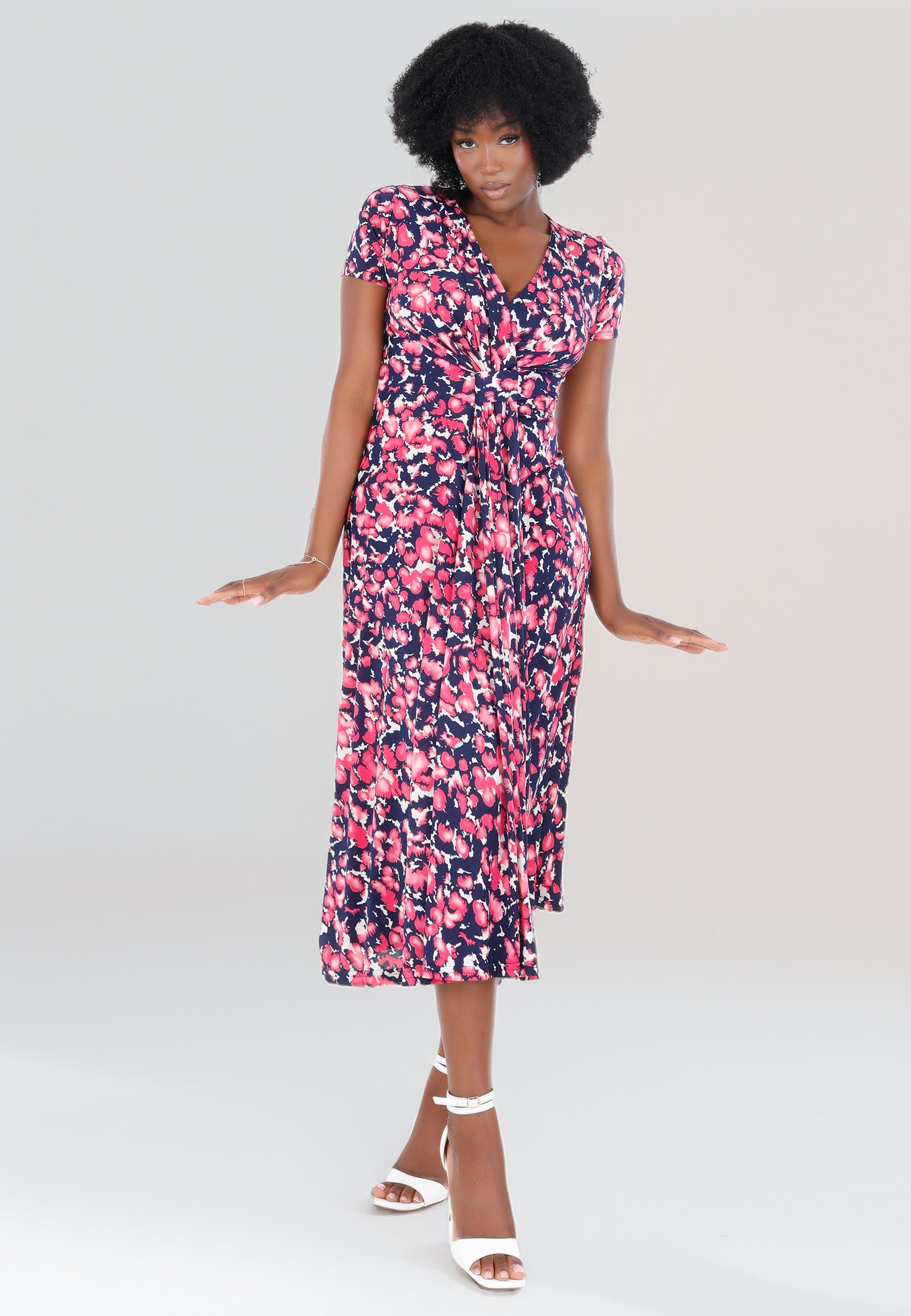 • Raffinierter Faltenwurf kaschiert und betont gleichzeitig die Taille.