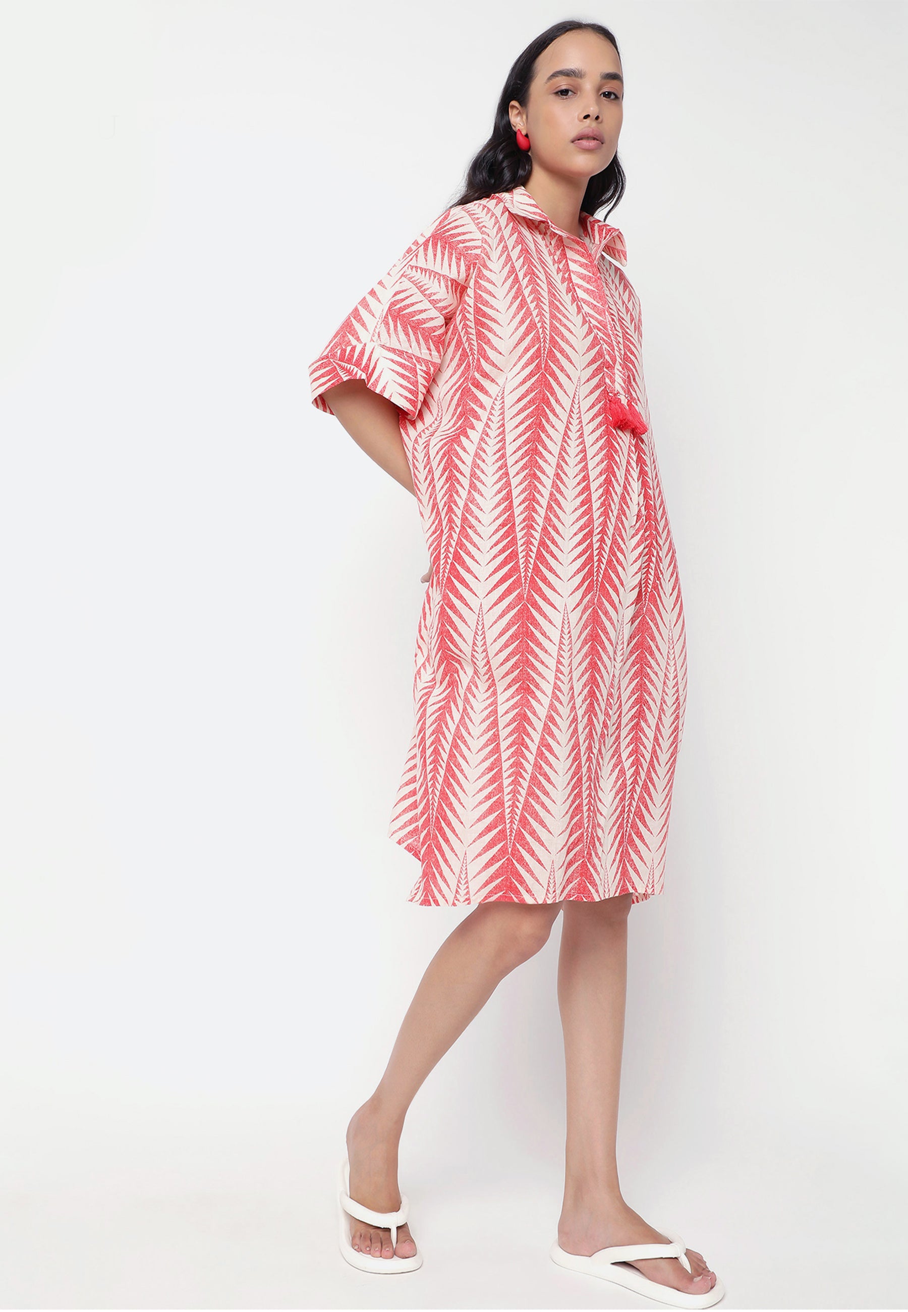 Das Kleid besticht durch ein lebendiges, gewebtes Muster, das sofort ins Auge fällt und für gute Laune sorgt. Das Design ist modern und doch zeitlos, ideal für modebewusste Frauen, die auf Qualität und Stil Wert legen.