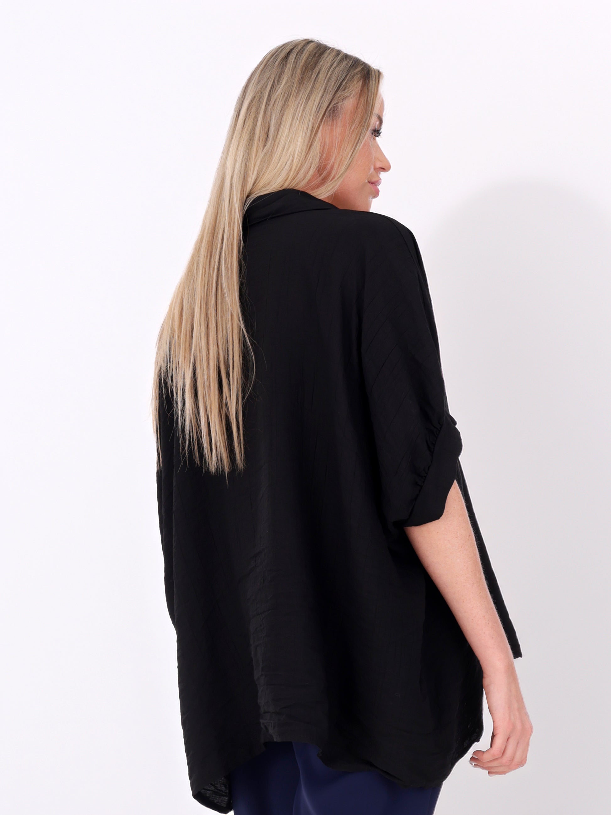 Der klassische Hemdblusenkragen und die durchgehende Knopfleiste verleihen der Bluse einen Hauch von Eleganz, während die modisch überschnittenen Ärmel mit aufgerolltem Abschluss einen modernen Twist setzen. Die leicht asymmetrische Saumlinie, hinten etwas länger geschnitten, sorgt für eine fließende Silhouette und kaschiert gleichzeitig auf charmante Weise.